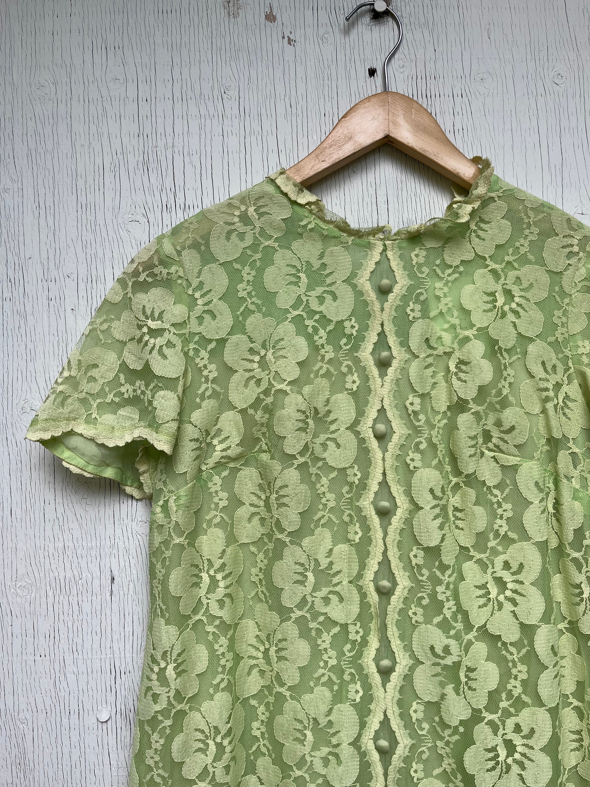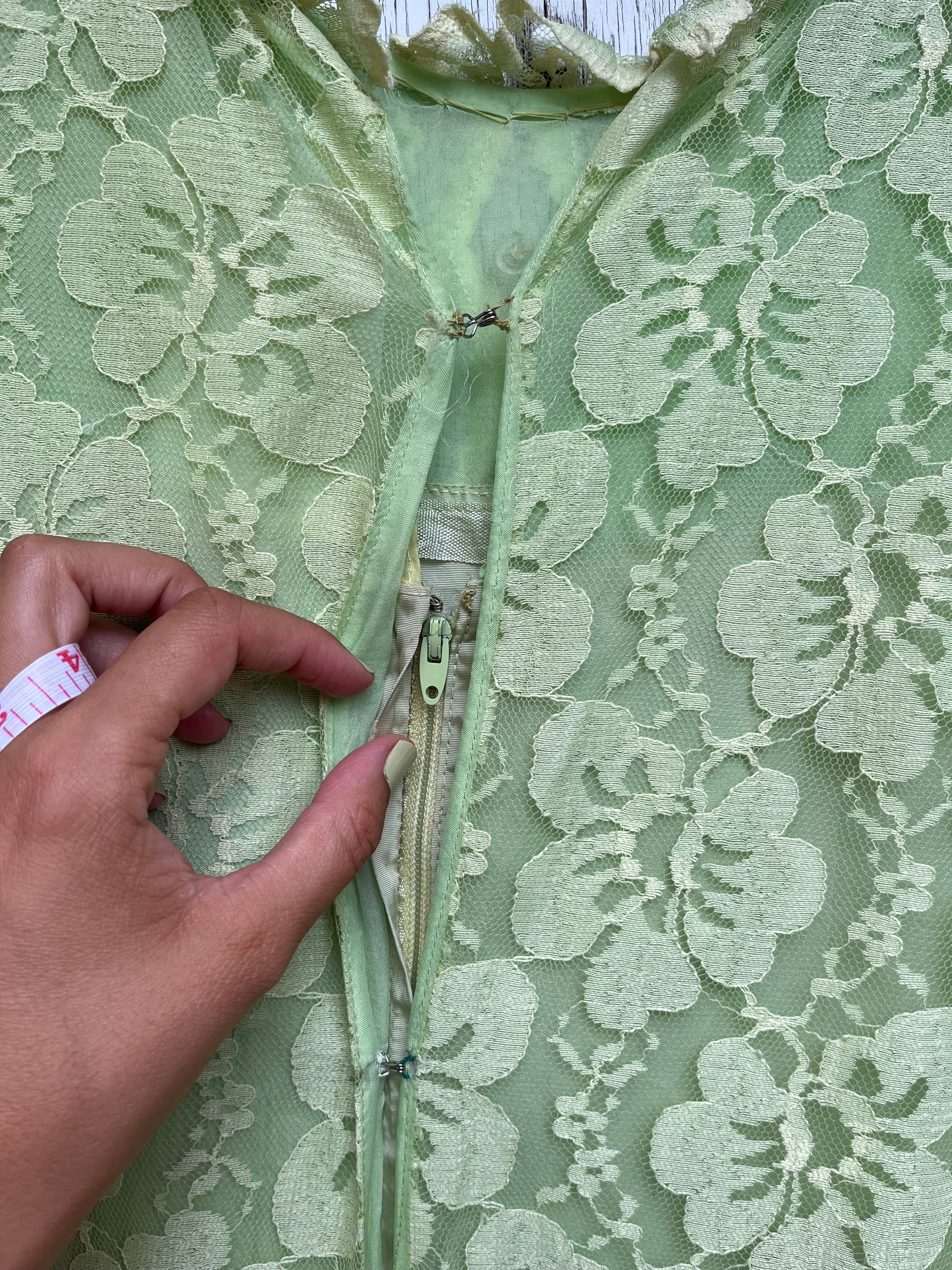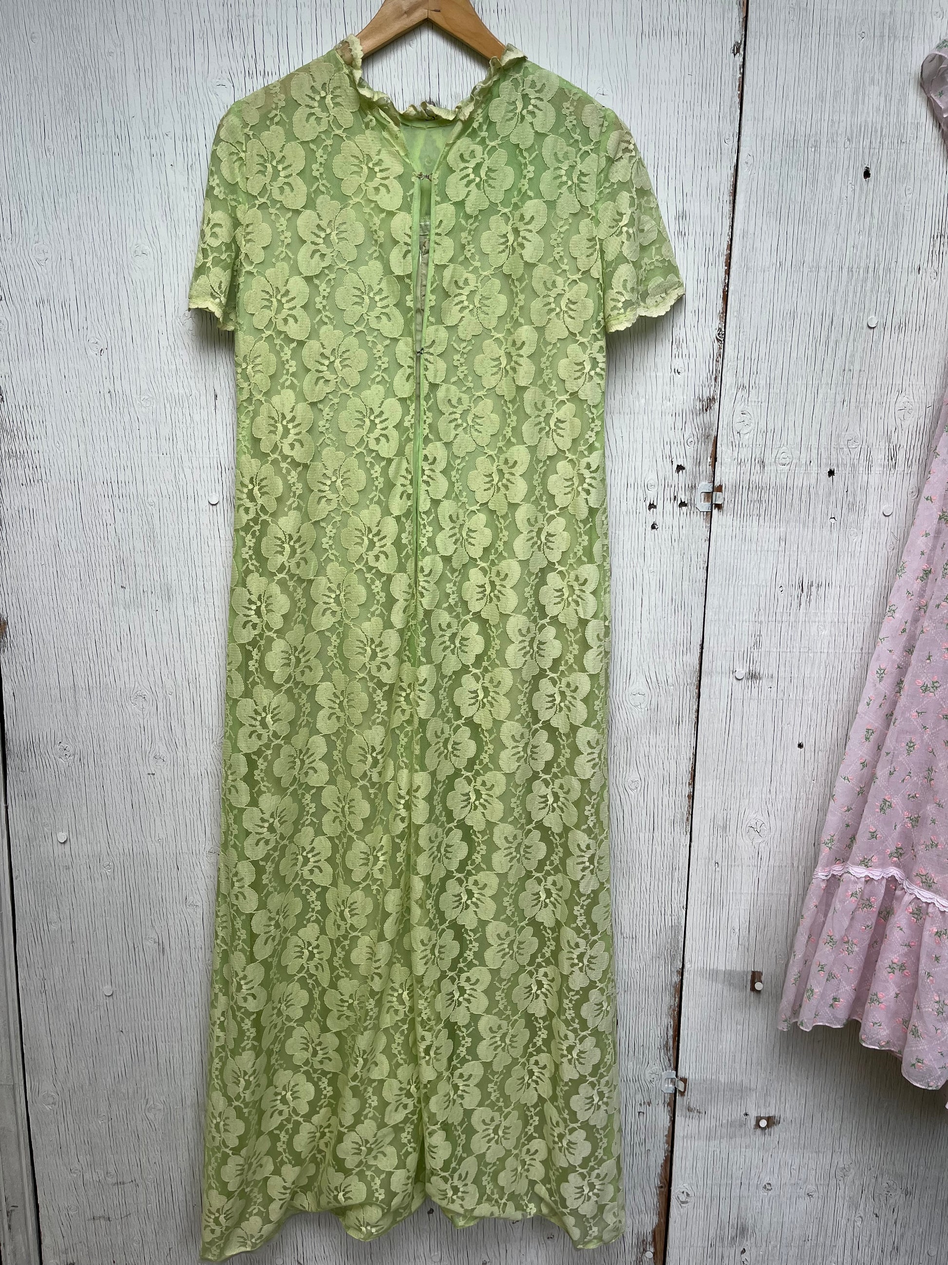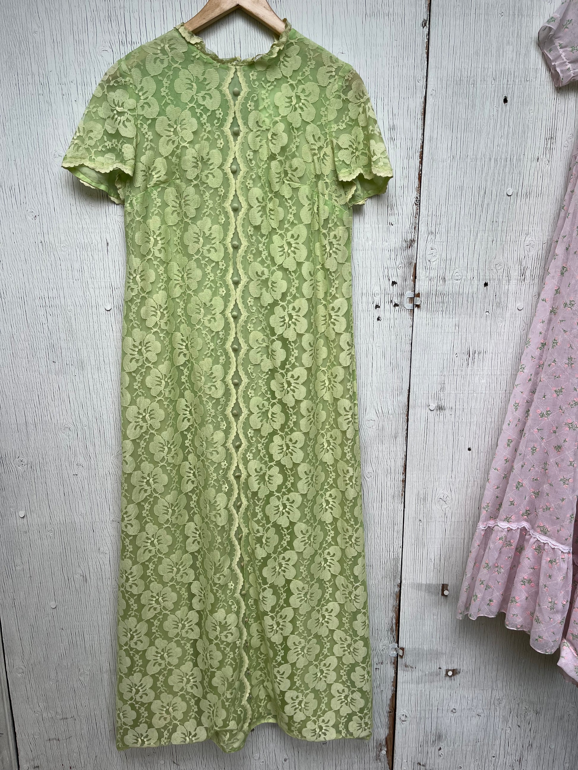 Floral Lace Maxi Dress. Sheer green lace overlay with delicate floral motifs and short sleeves. Features a row of covered buttons down the front, scalloped trim at the collar and sleeves, back zipper closure, and a soft lining for comfort. A romantic vintage piece with a graceful silhouette perfect for spring and summer events. Chest/Bust: 36", Shoulder Width: 30", Sleeve Length: 7", Length: 53", Hem: 58", Waist: 38", Hip: 43"