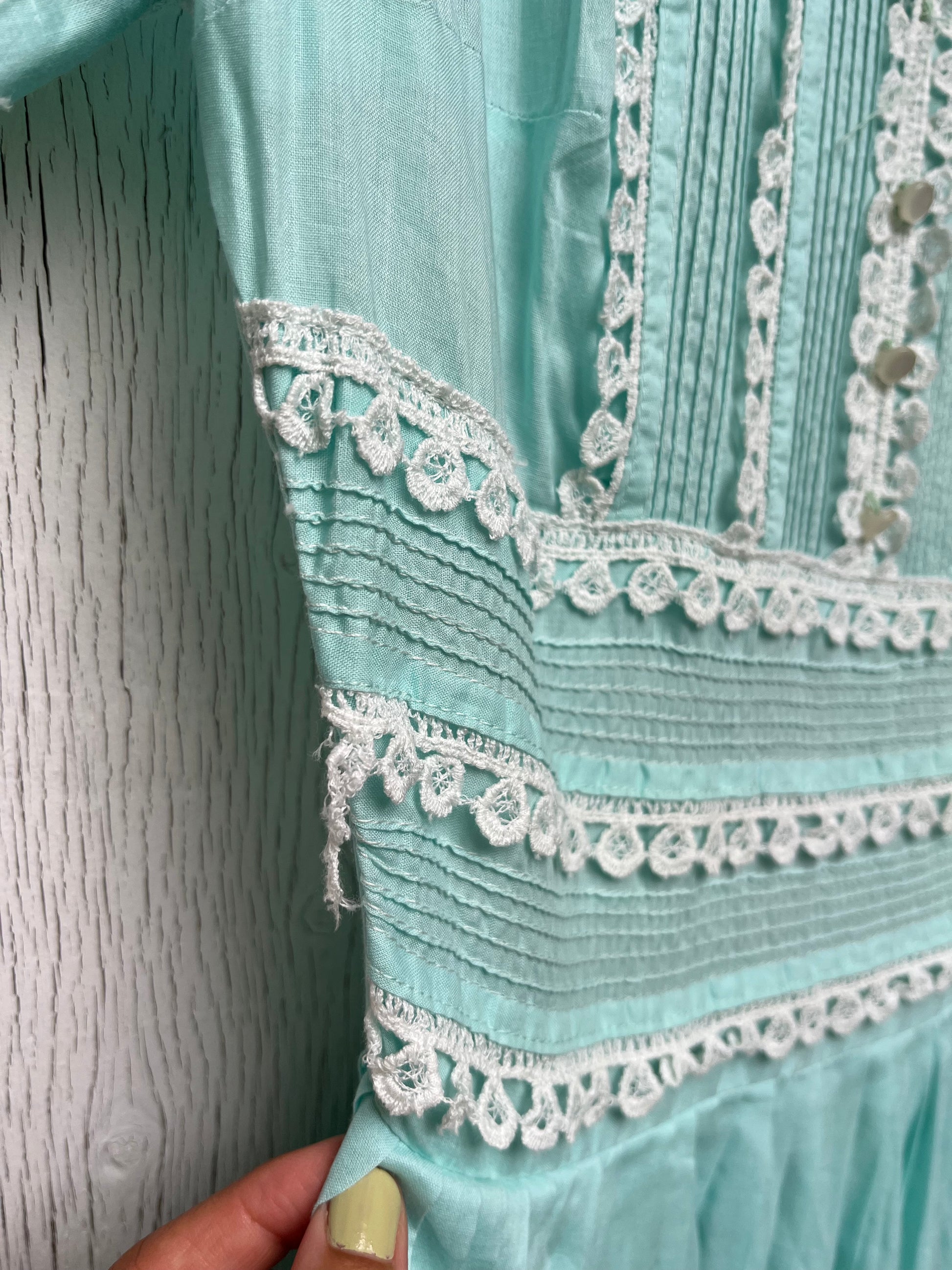 Slight wear to lace trim on one sleeve. Chest/Bust: 32", Shoulder Width: 26", Sleeve Length: 7", Length: 37", Hem: 160", Waist: 25", Hip: 34"