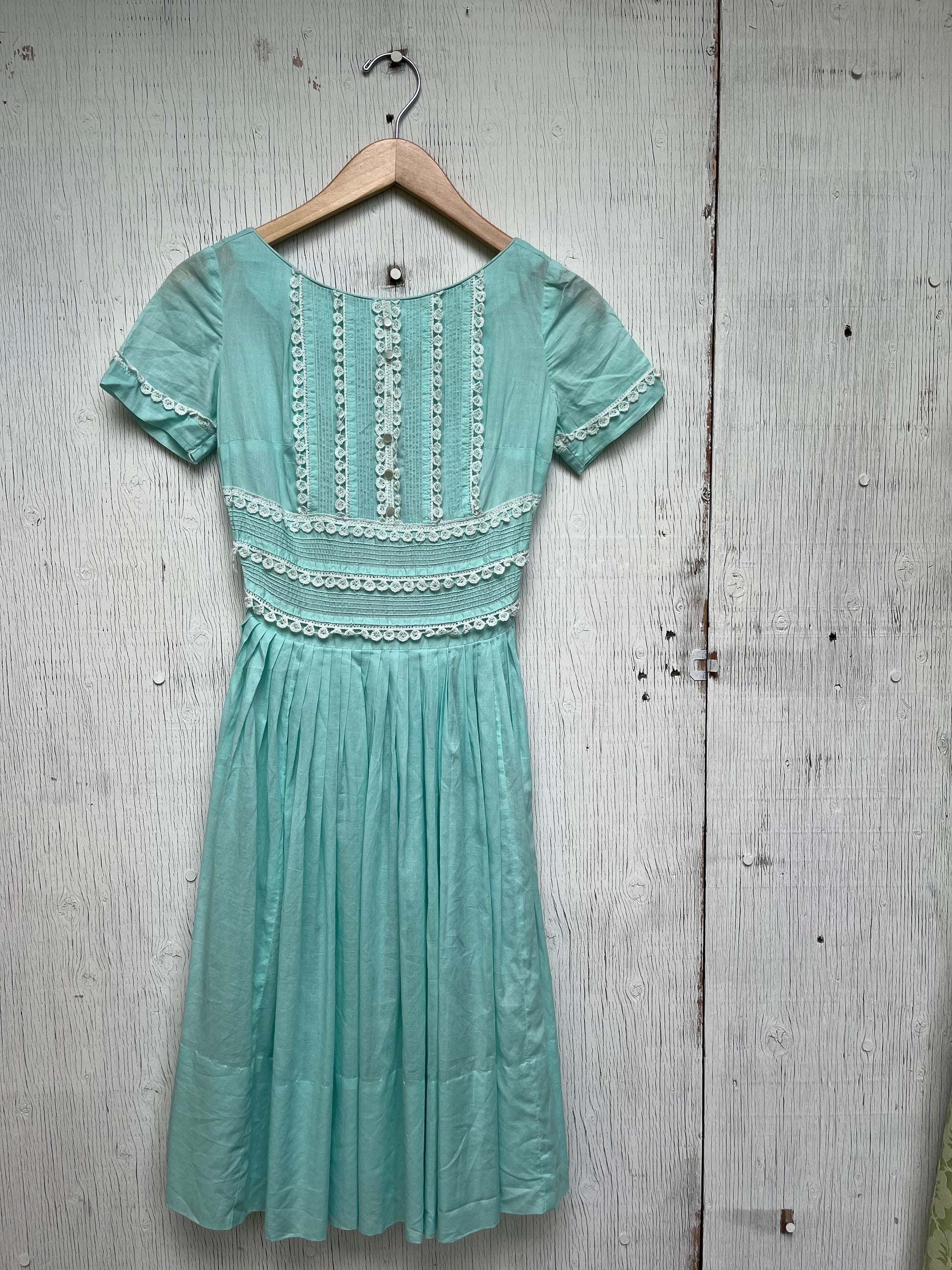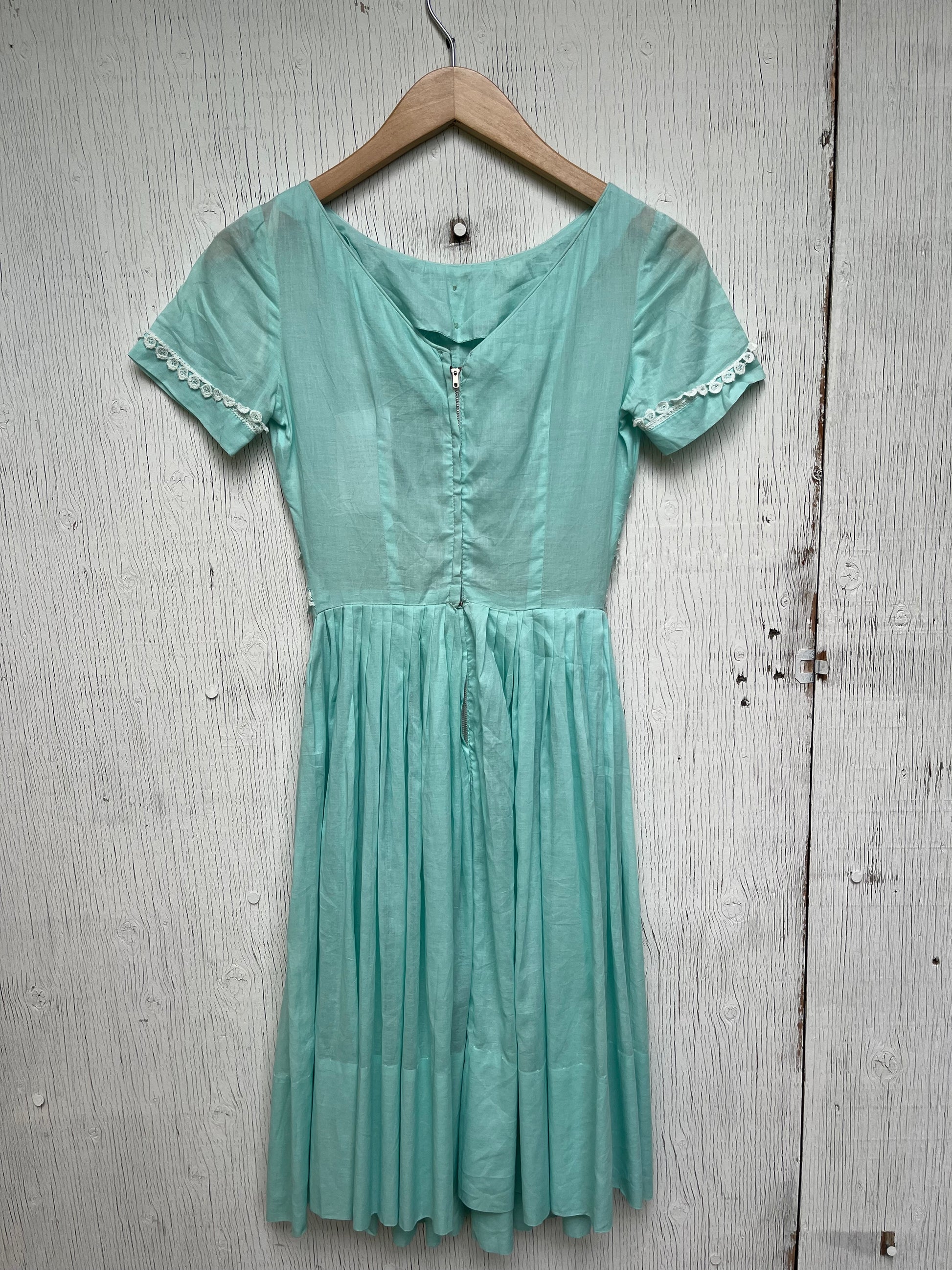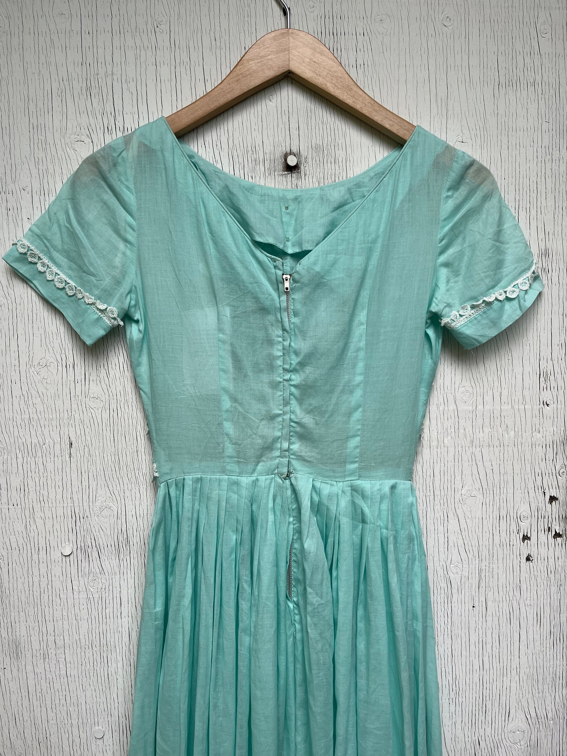 1960s - Mint Green Lace Trim Short Sleeve Dress