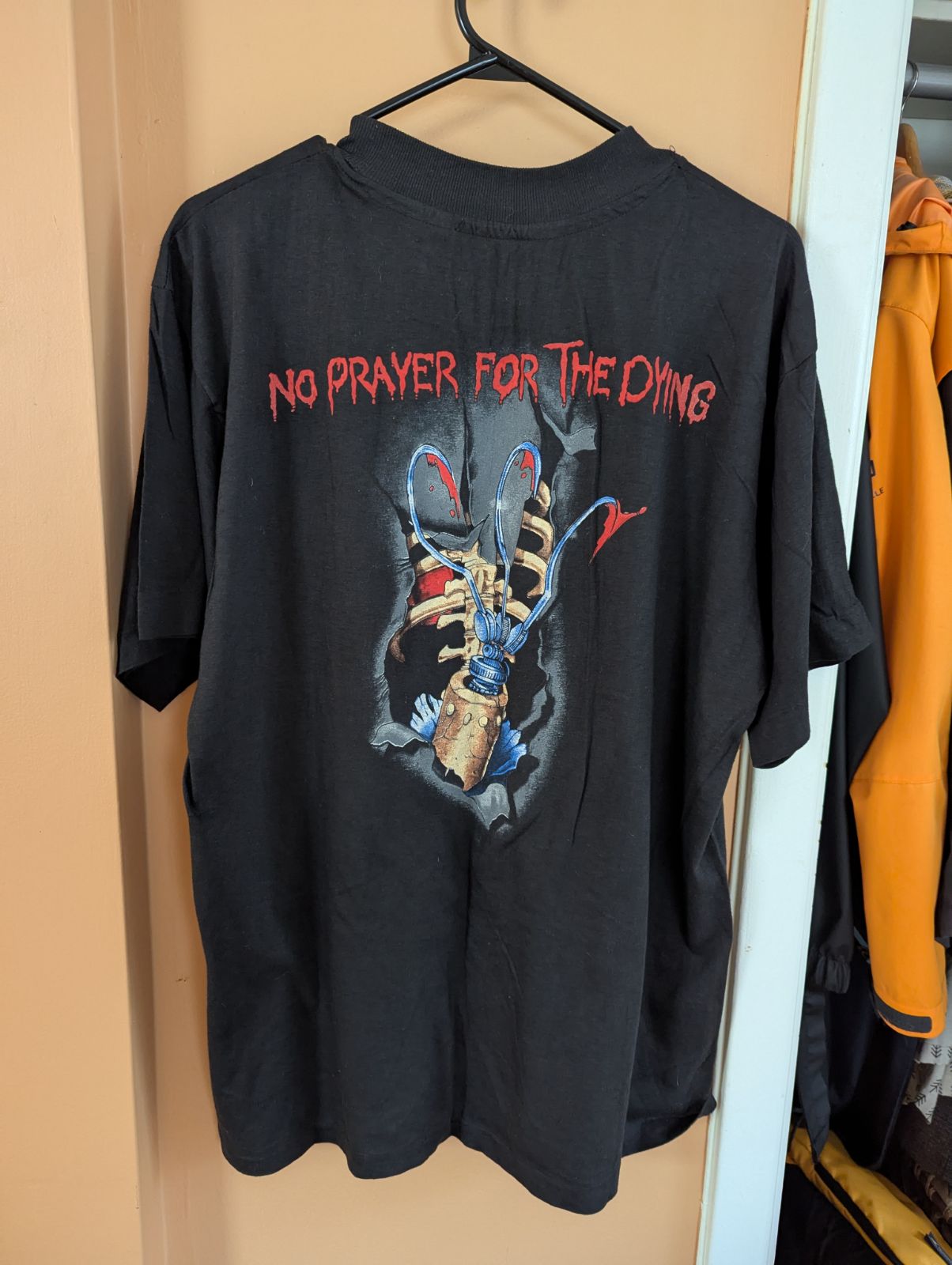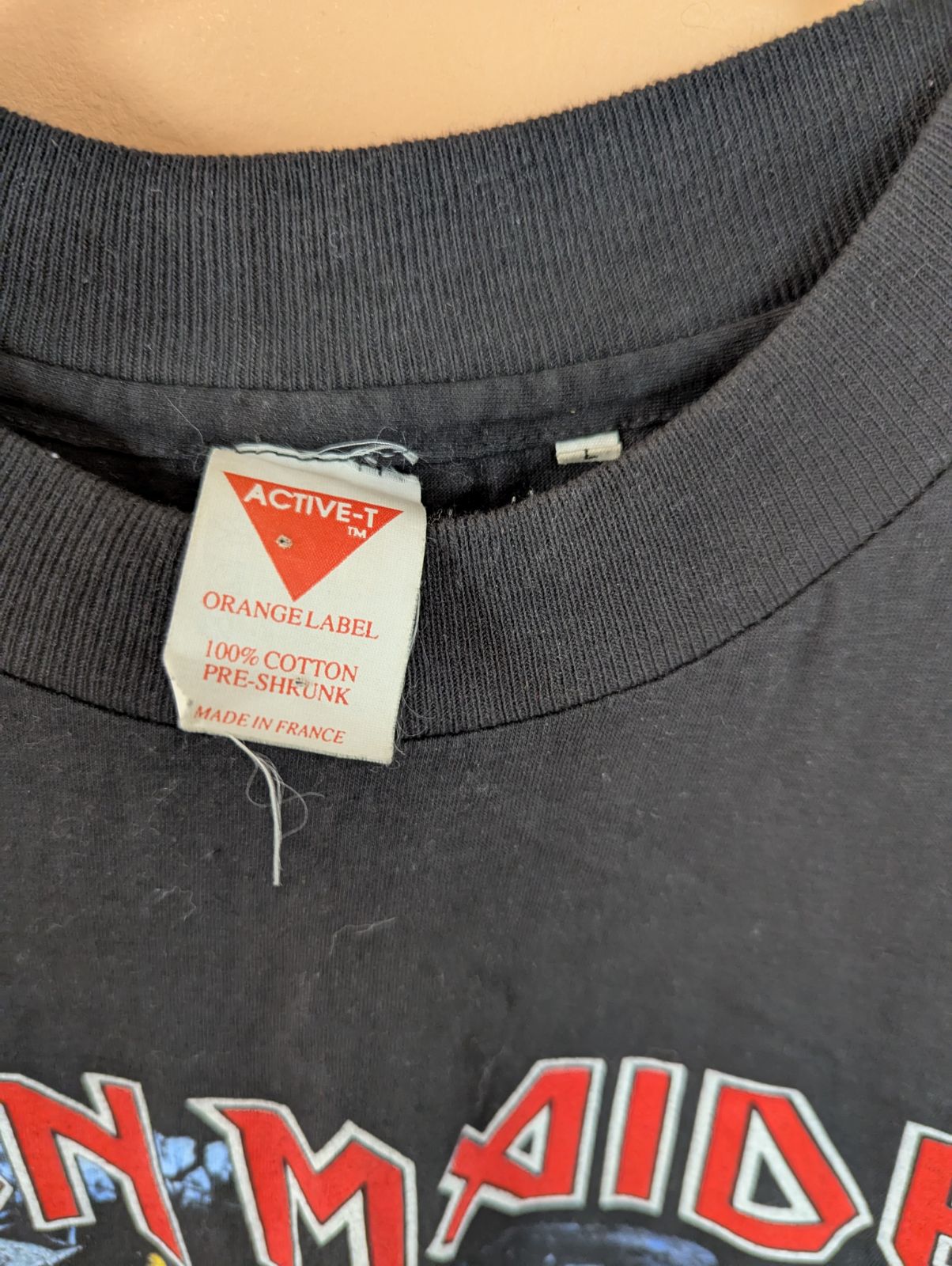 Original 1990 Iron Maiden tee featuring the No Prayer for the Dying artwork. Rare Active-T Orange Label, Made in France edition. In excellent vintage condition, made from 100% cotton and strong graphics. A true collector's piece from the No Prayer for the Dying era. Hard to find in this condition. Perfect gift for Maiden fans and serious vintage collectors alike.
