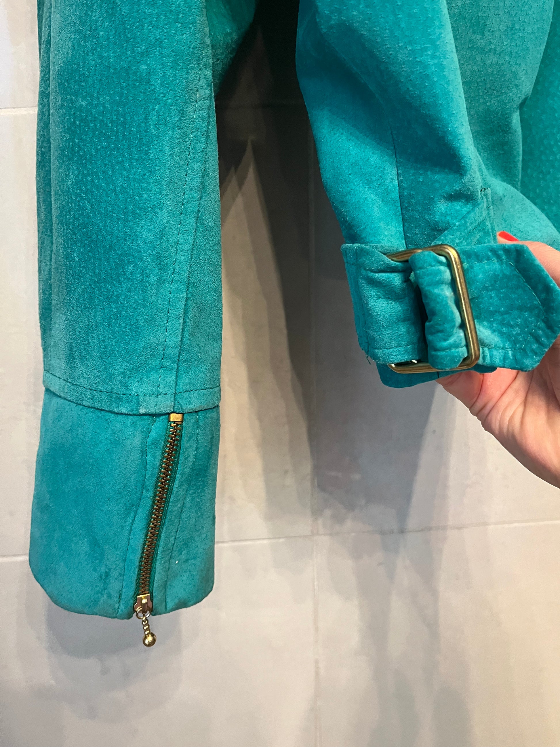 This 80s Danier Leather Suede Bomber jacket is in amazing condition. Gold hardware on the front zipper, sleeve zippers, & sides buckles. It is a cropped cut with that bold 80s shoulder.