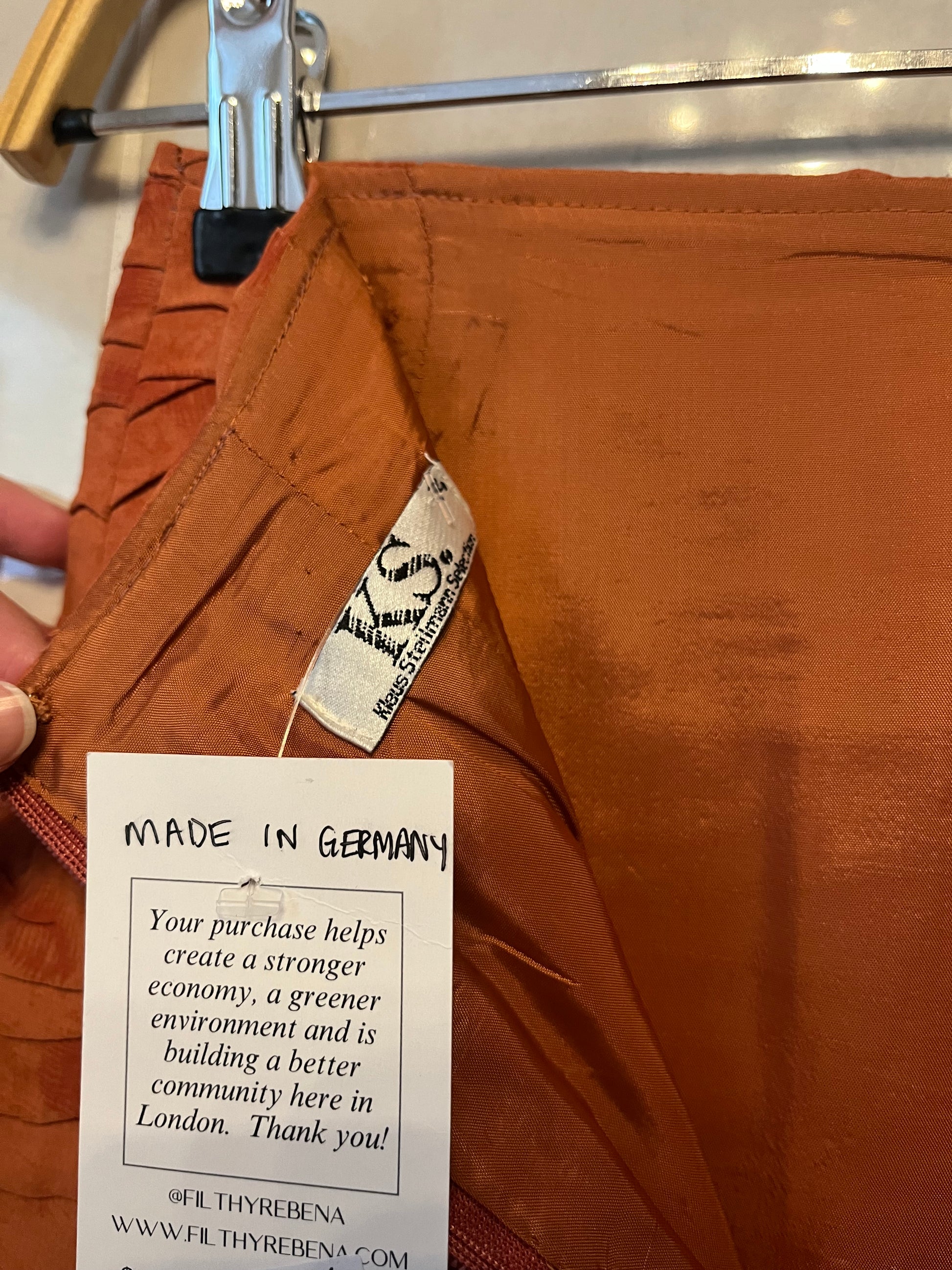 The details of this mini skirt are so great; the scalloped like tucking of the fabric, the muted print, and the back vent. This skirt has a centre back zipper and is fully lined. The skirt feels like silk, but is actually viscose with an acetate liner. Made in Germany.