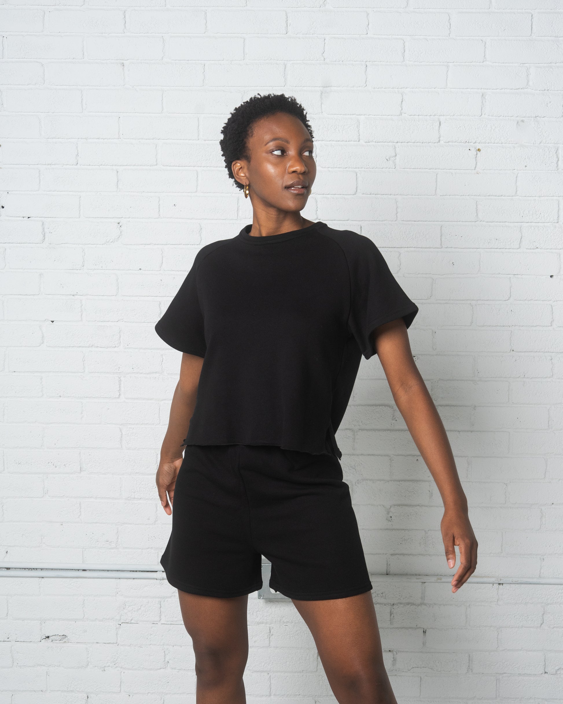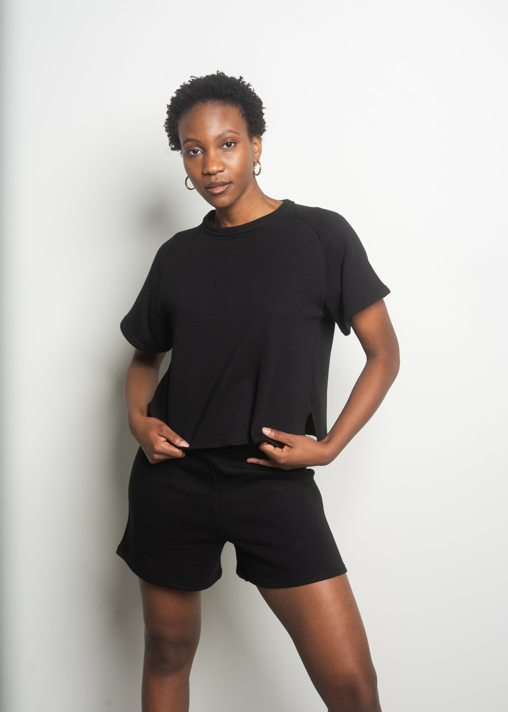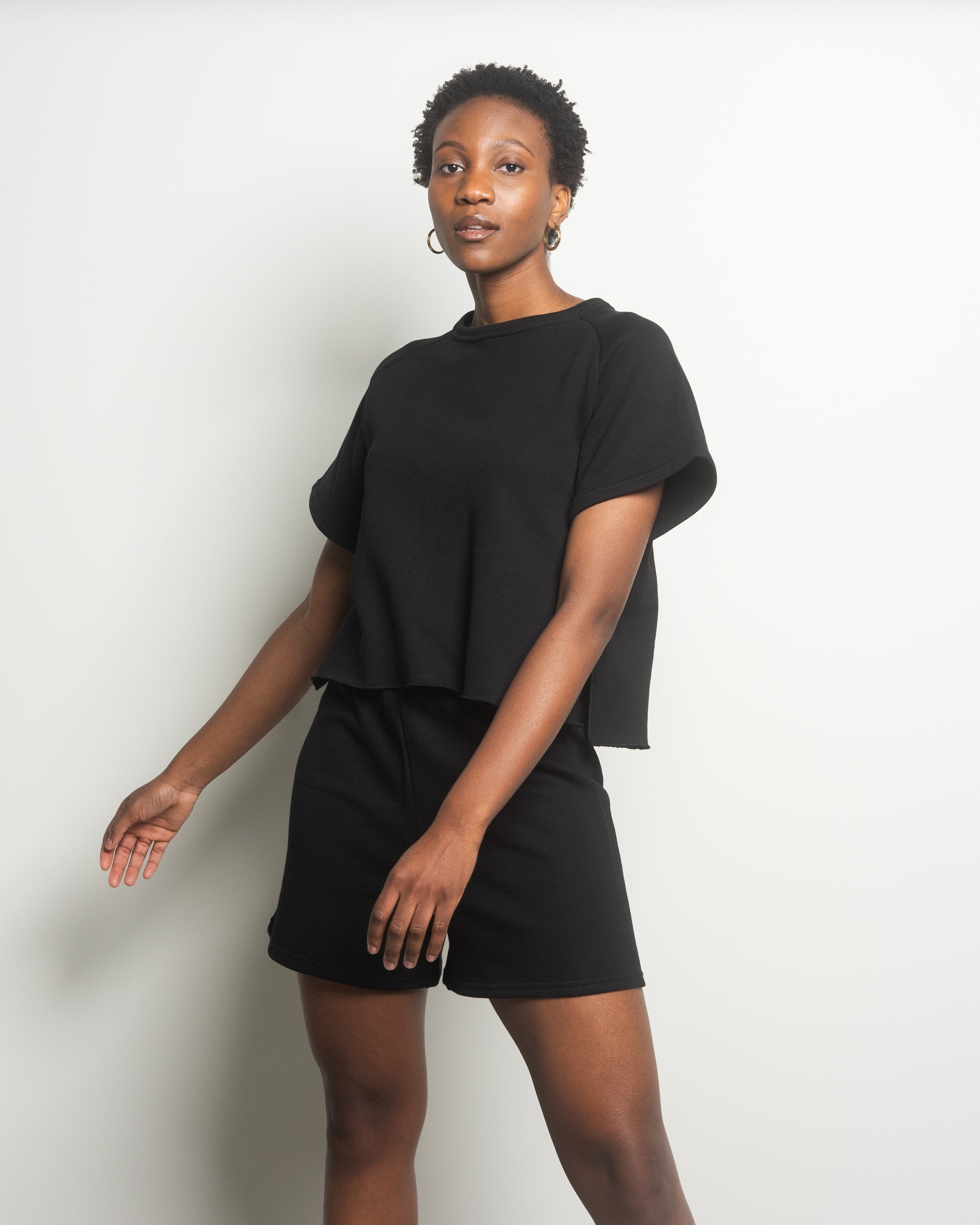 Recycled Cotton Terry Summer Sweatsuit comes in three colours; black, beige, & white. It has marrowed hems that give it a fun and free lettucey edge.