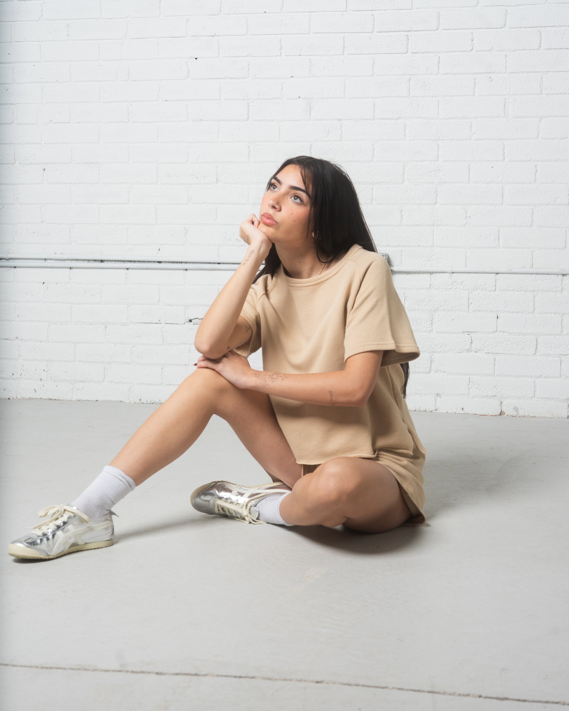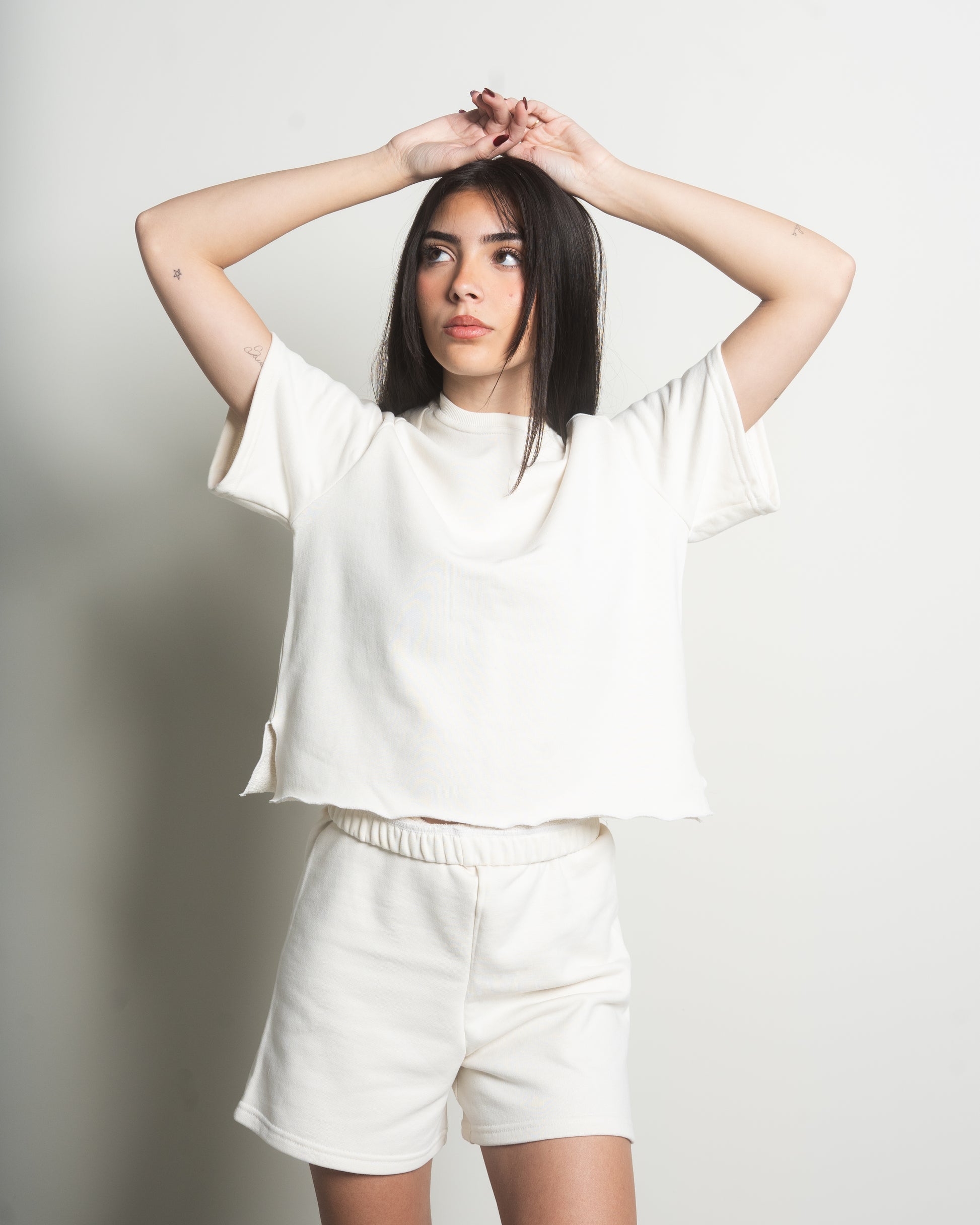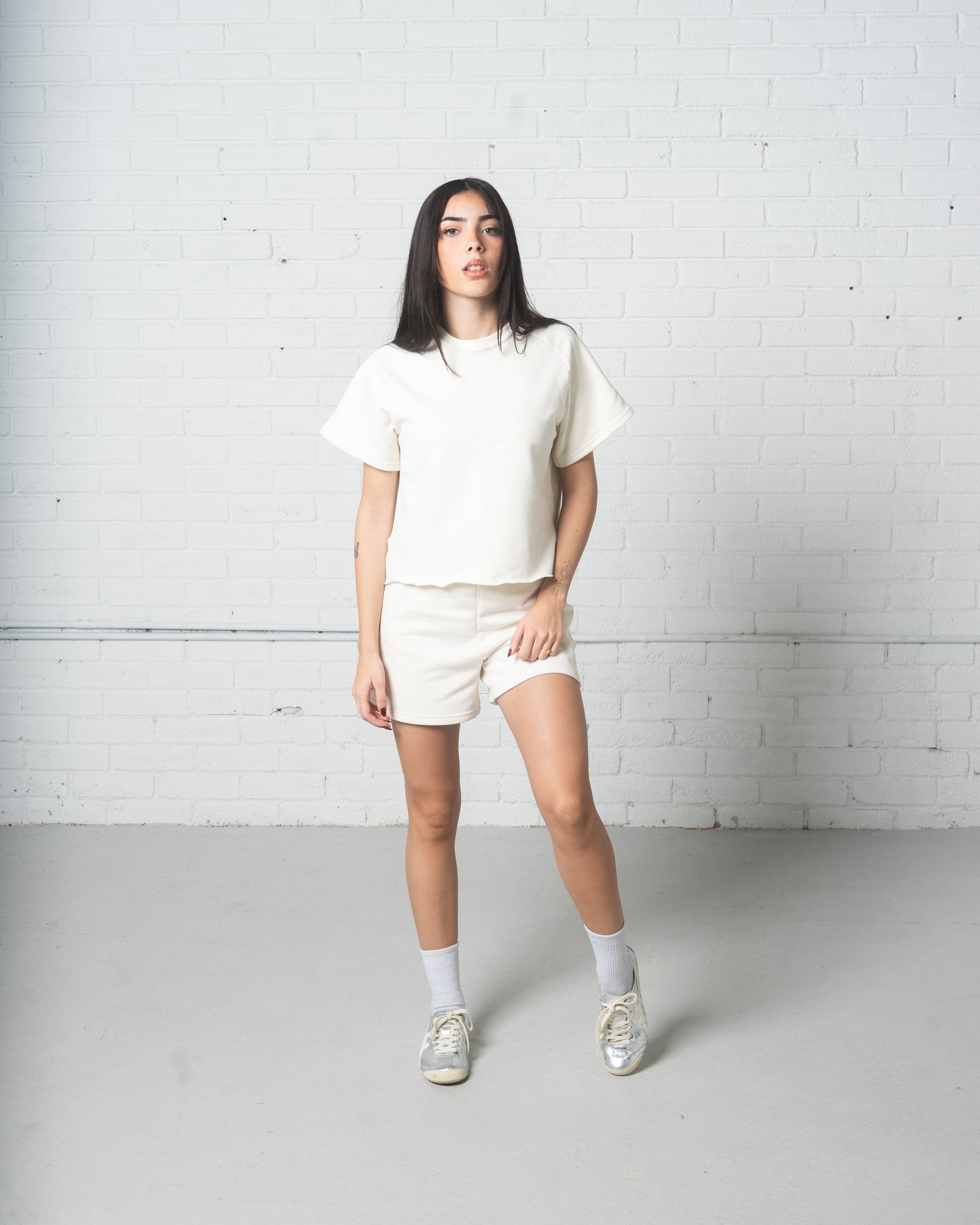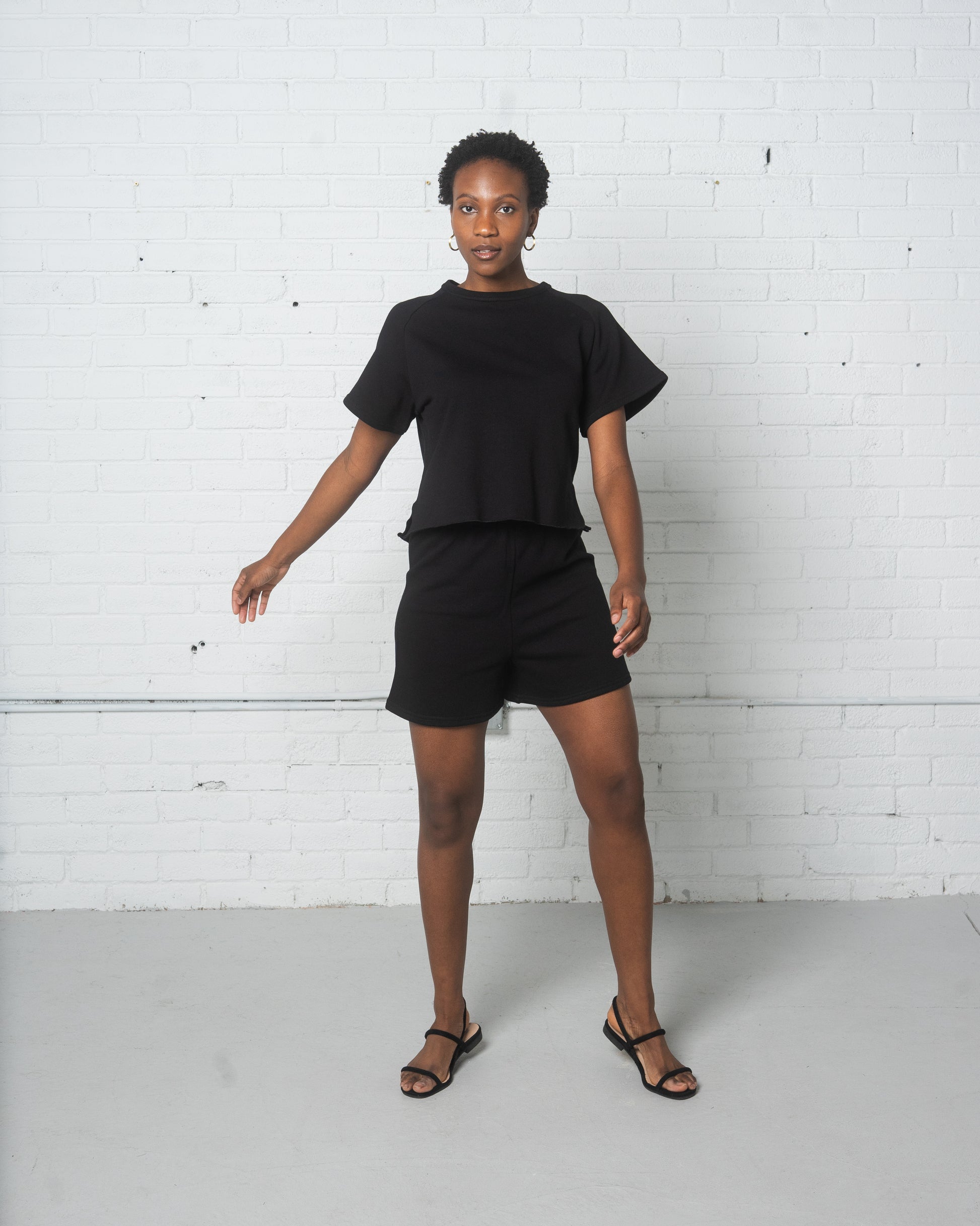 Recycled Cotton Terry Summer Sweatsuit comes in three colours; black, beige, & white. It has marrowed hems that give it a fun and free lettucey edge.