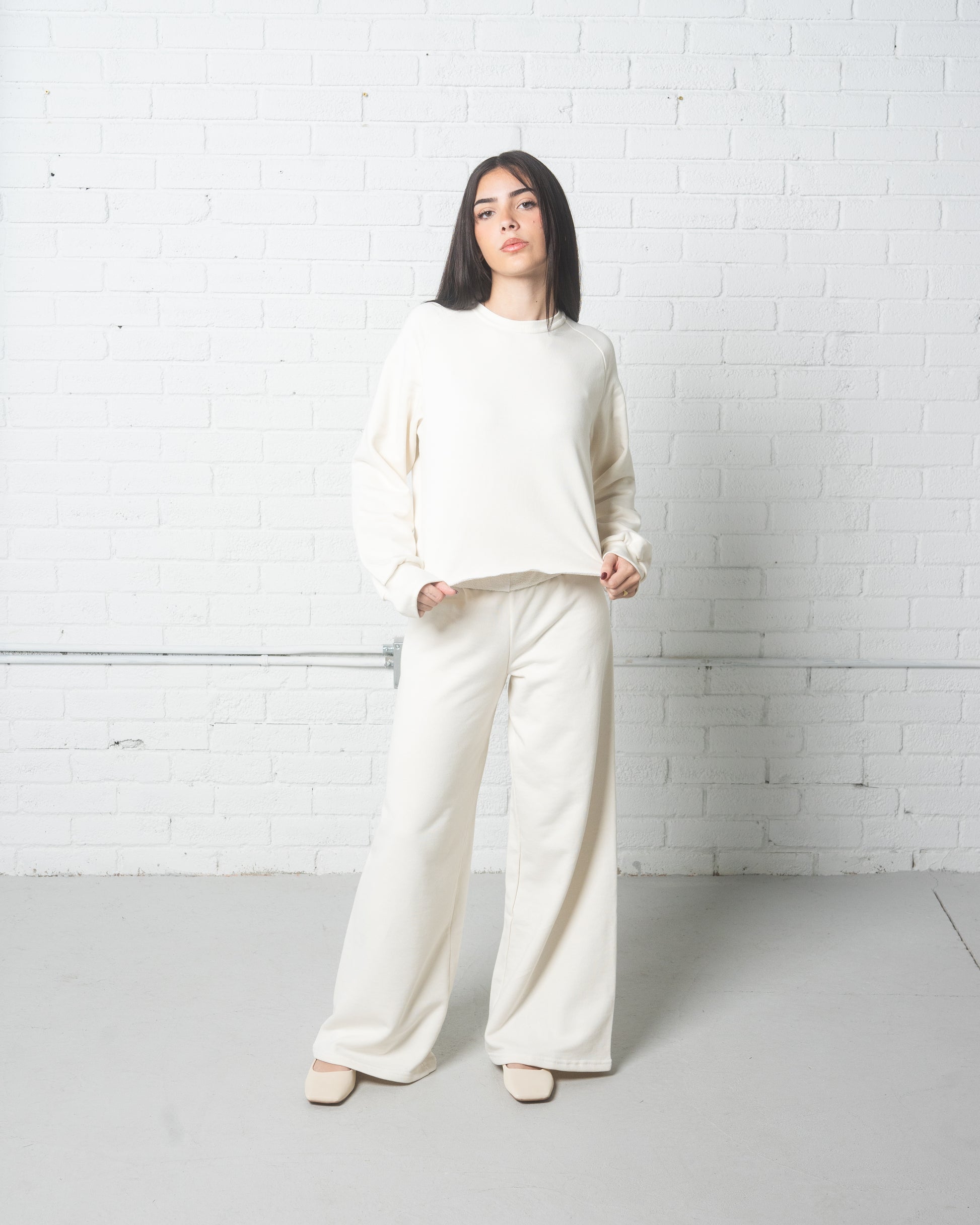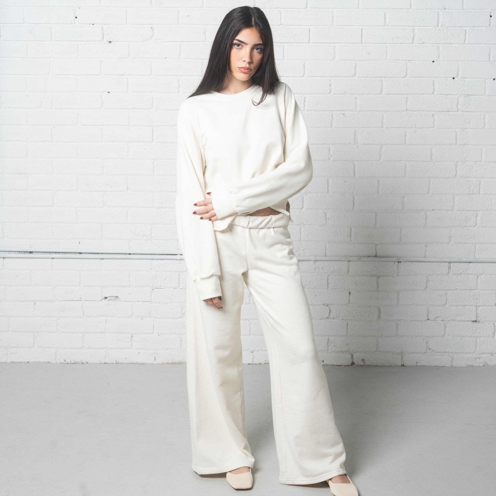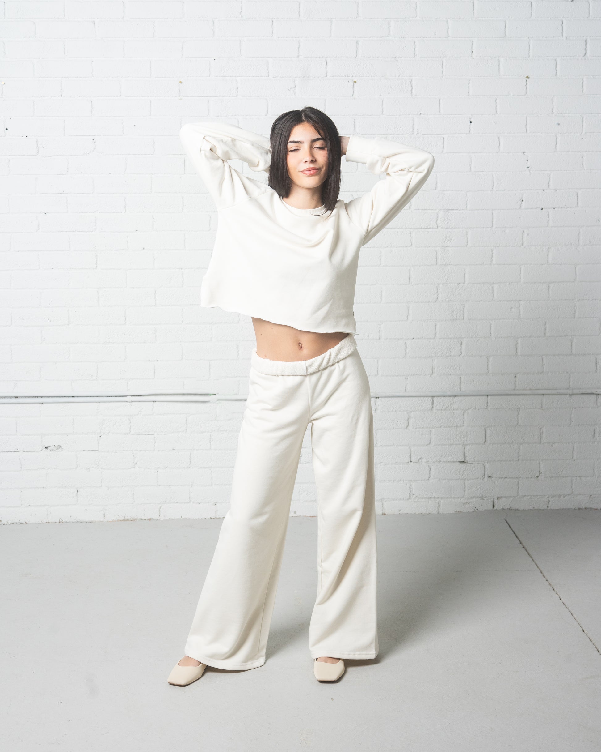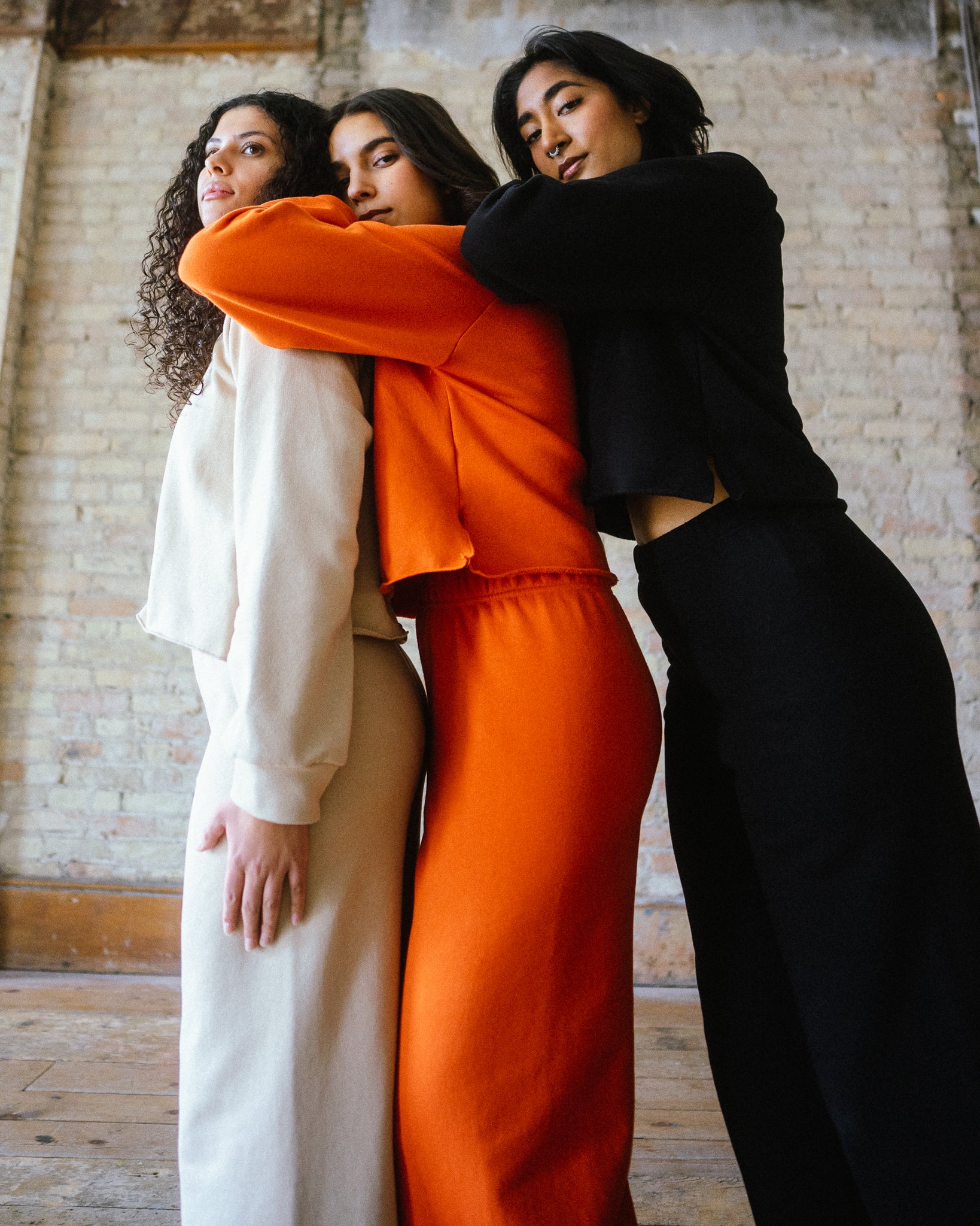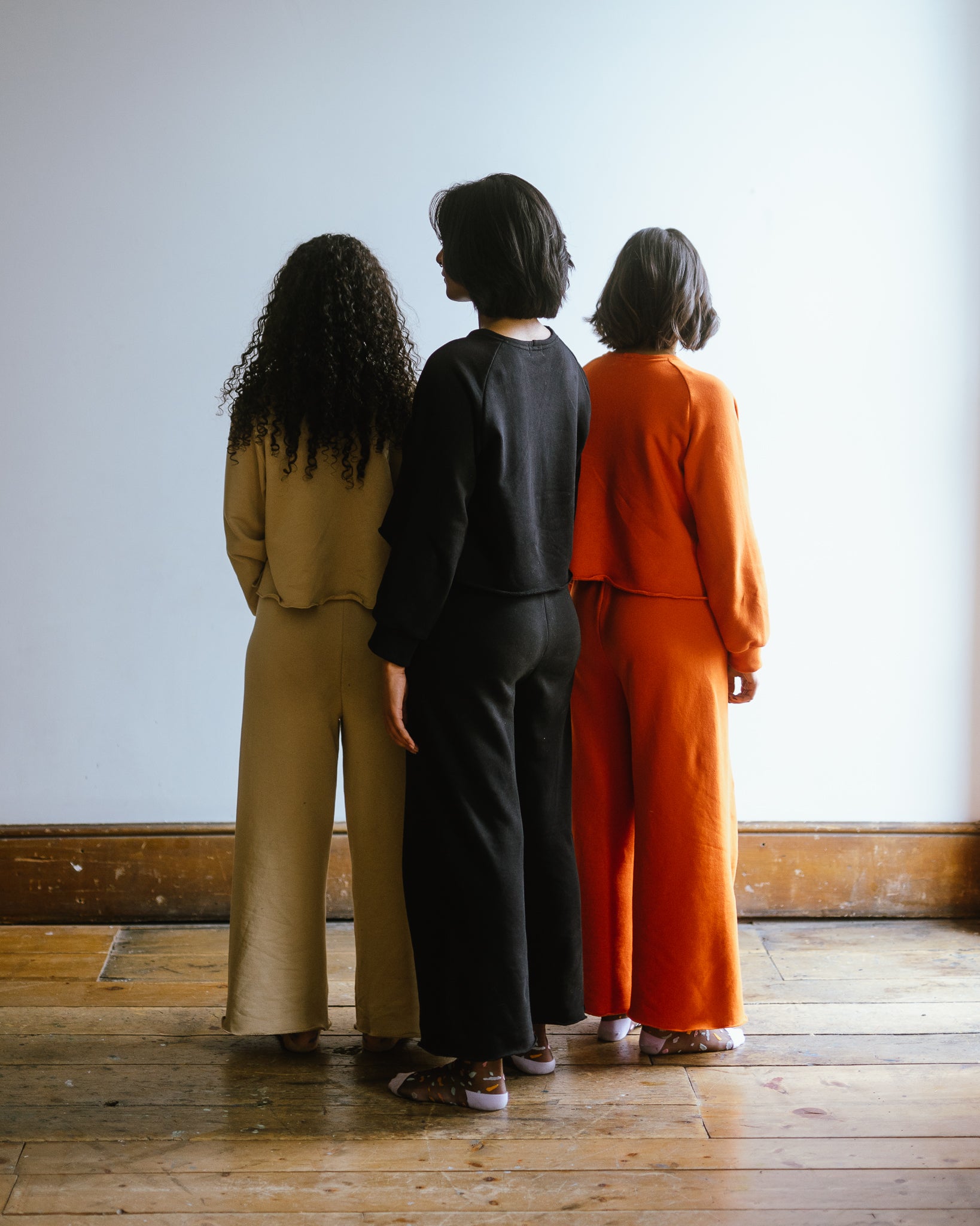 Recycled Cotton Terry Sweatsuit comes in four colours; black, beige, white, and rusty orange. It has marrowed hems that give it a fun and free lettucey edge.