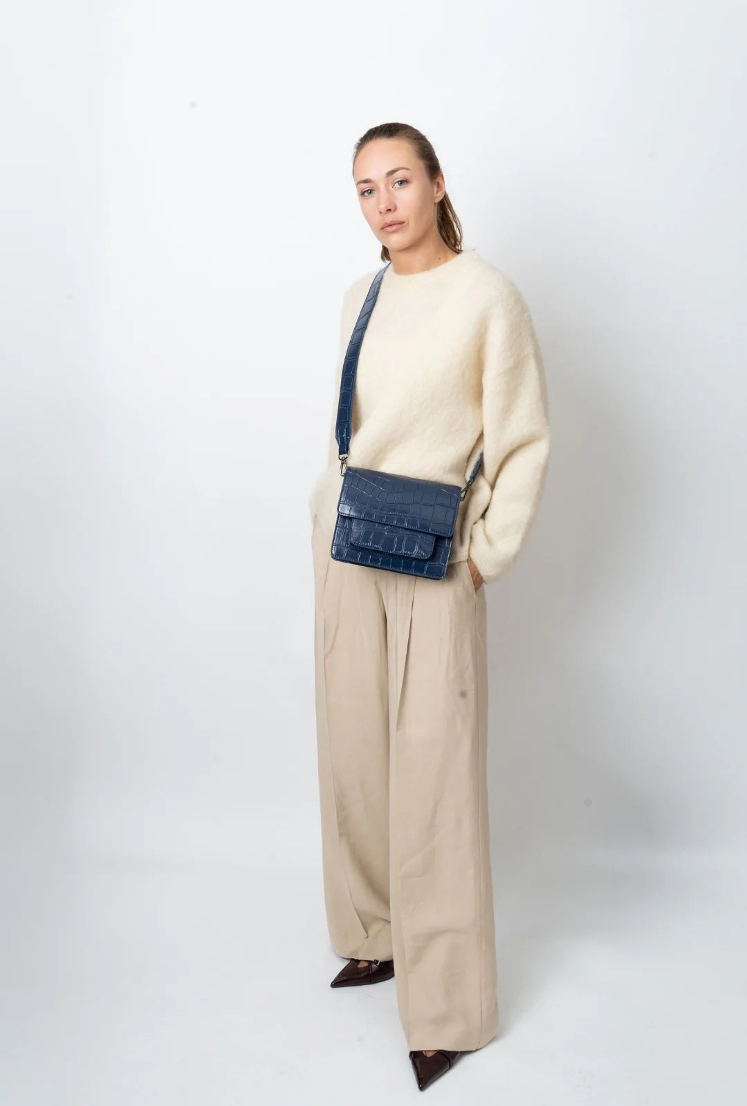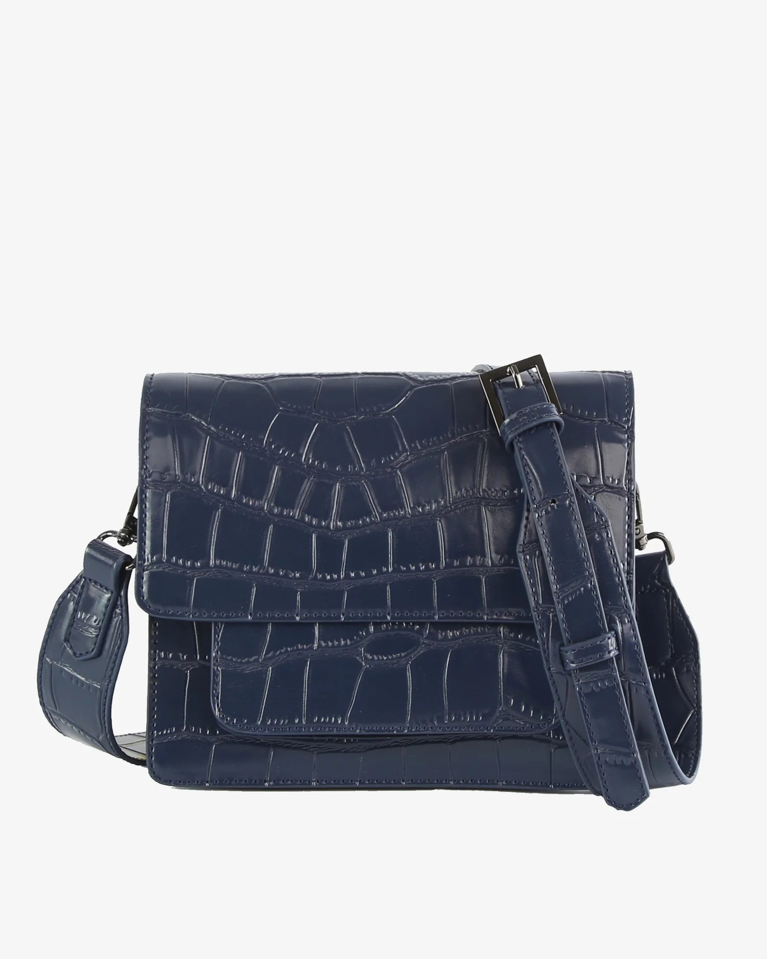 Crossbody bag with magnetic closure and adjustable strap. The bag has an outer front pocket and one large compartment with an inner pocket.
