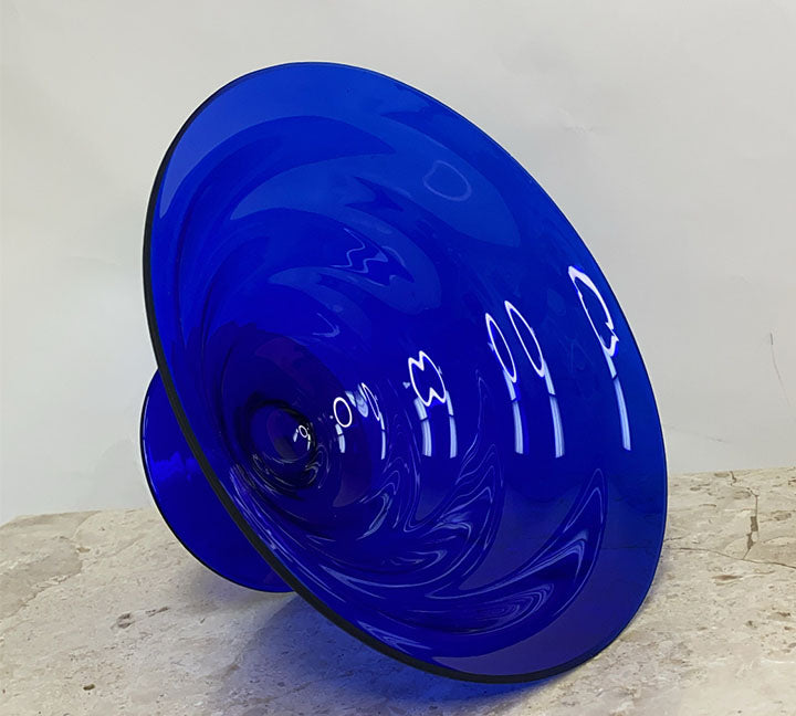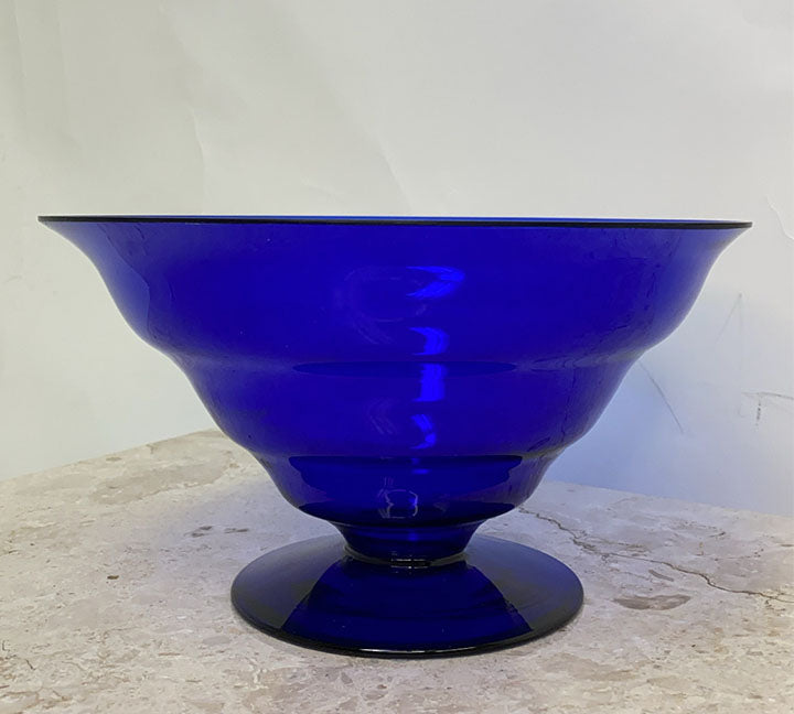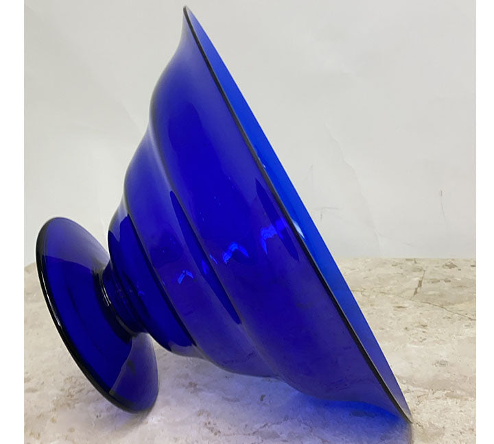 A super sophistaced art star 80s fruit bowl! Beautiful bubble royal blue glass. Pedestal to really raise the value of your fruit. Circa: 80s