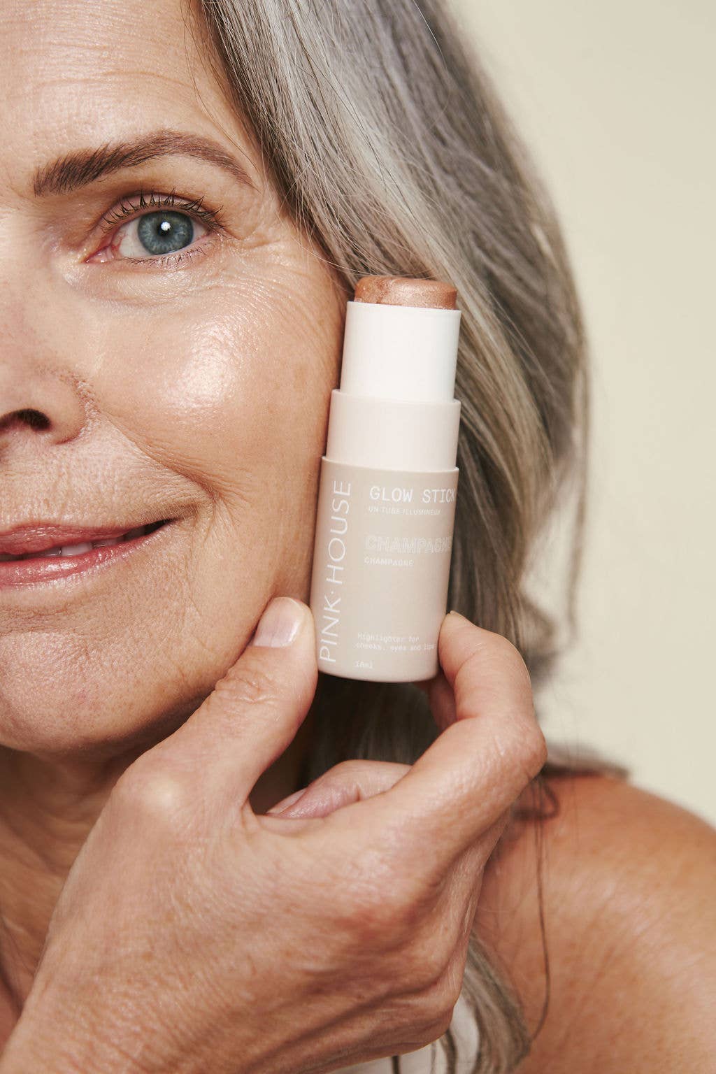 Enhance your natural glow with our multi-use, creamy Glow Sticks. Glow Sticks have a slight shimmer that gives skin an instant, radiant glow. Buildable in nature, they can be used for that no-makeup makeup look on bare skin or layered on top of foundation for a bold look. Completely natural, vegan, and cruelty-free, this product is infused with three types of oils to keep skin moisturized while giving a dewy finish. Champagne is a universally flattering shade that creates a warm, sun-kissed glow. A deep gold tone with a pearlescent finish, it gives cheeks a luminous pop while letting your natural beauty shine through. INGREDIENTS: Shea Butter, Coconut Oil, Meadowfoam Oil, Candelilla Wax, E-Wax (Vegetable Emulsifying Wax), Rosehip Extract, Mica.