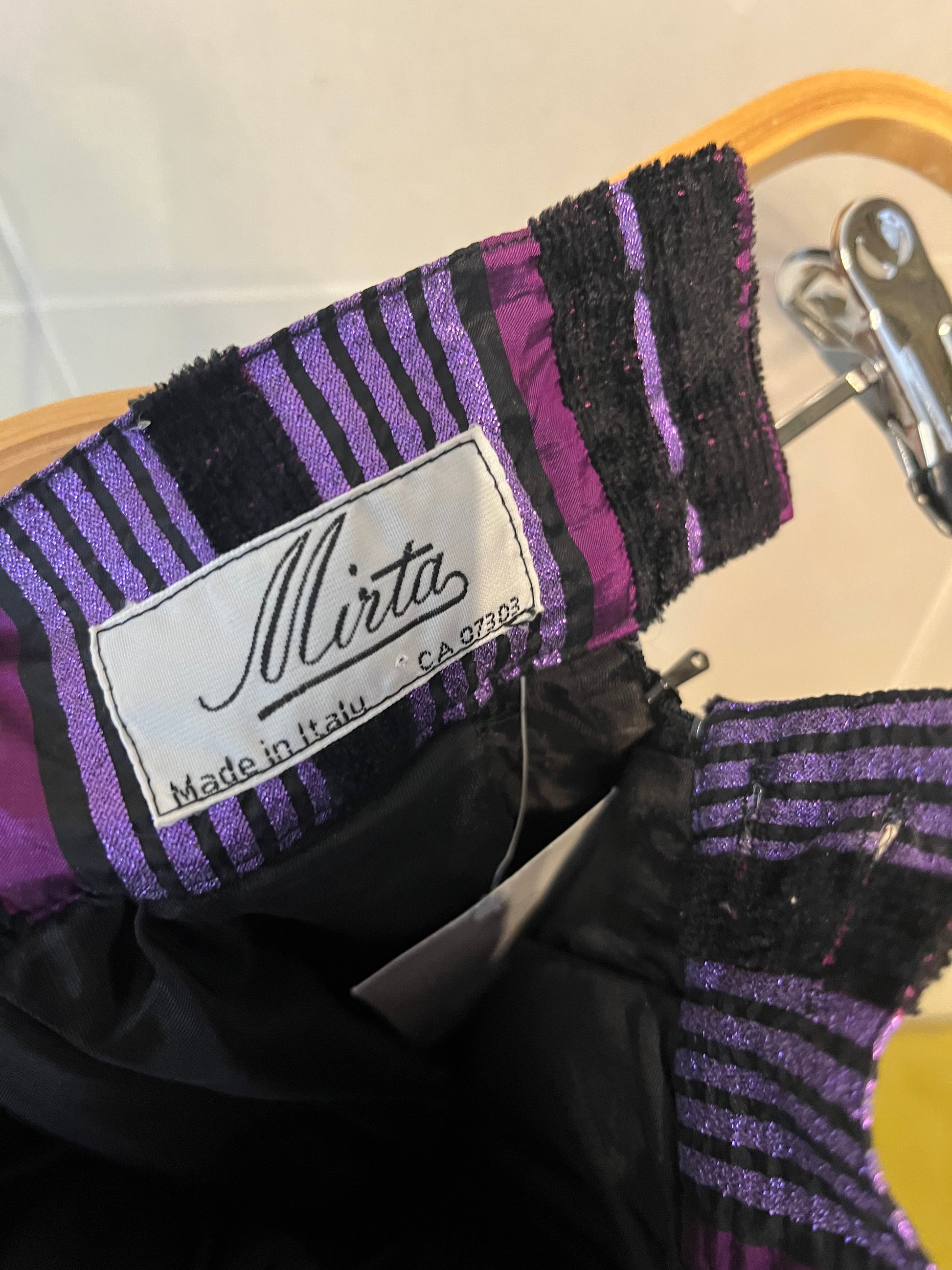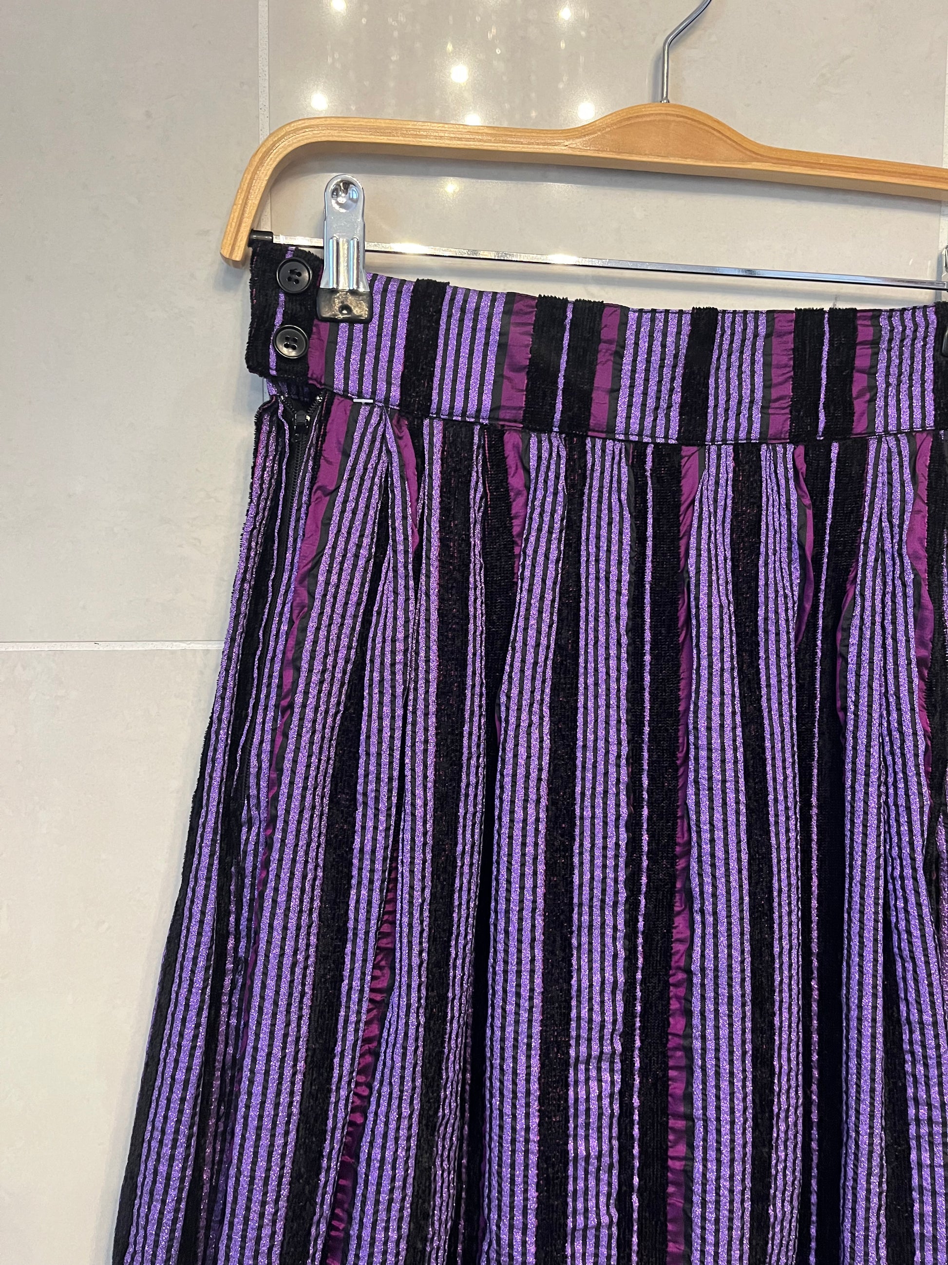 This beautiful silk skirt has the best raised striped texture to it! High waisted with two ruffled tiers. Made in Italy. Excellent craftmanship! Era 80s.