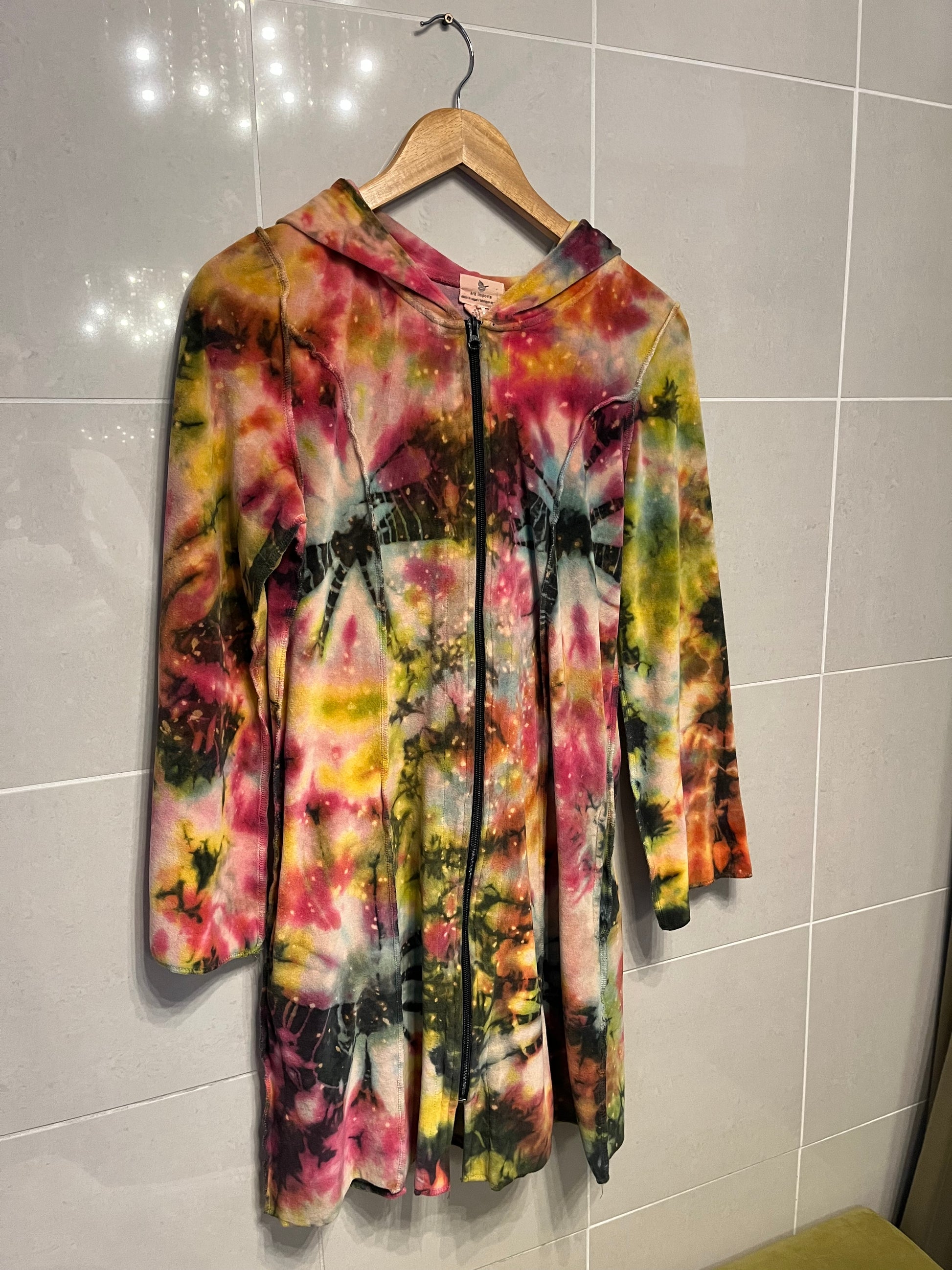 Super fun festival gear or everyday wear for that witchy woman. Velour tie dye print with a cotton lined tie dye hood that goes all the way down to the waist. A medieval Liripipe if we are being technical! Front zipper and pockets.