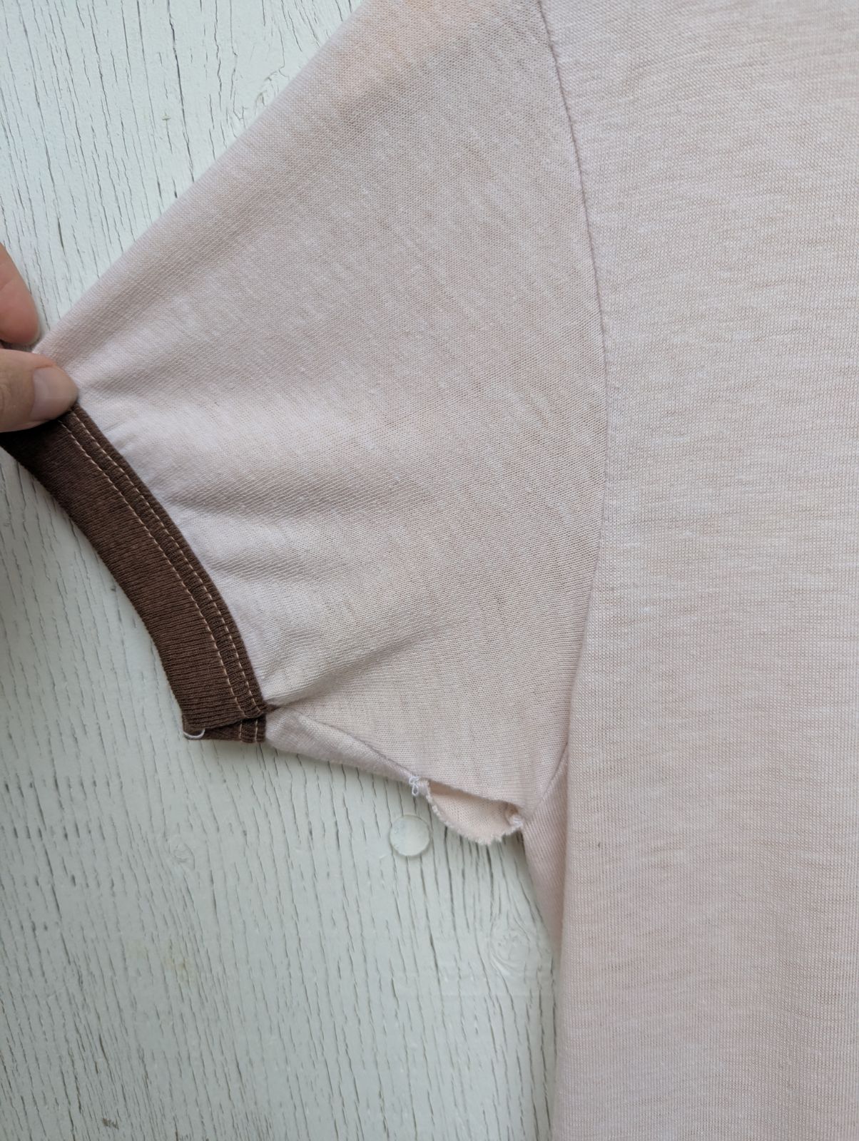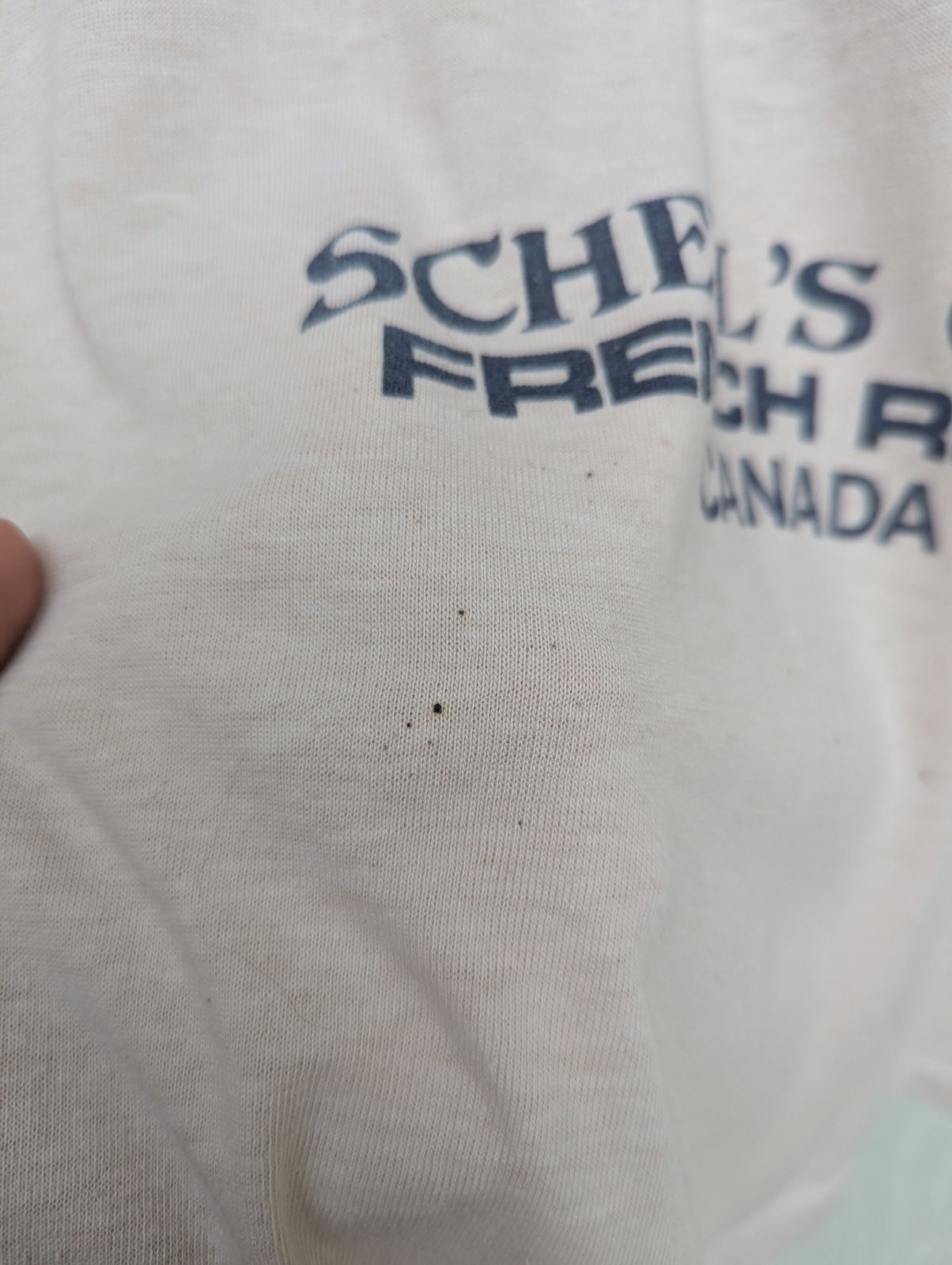 A true slice of 1970s camp nostalgia! This vintage ringer t-shirt comes straight from Schelle’s Camp, French River, Canada. Made in a soft beige cotton-blend with classic brown ringer trim at the collar and sleeves. The t-shirt features a bold moose graphic. T-shirt has a bit of character: a little wear throughout and some holes in the armpits (nothing a quick stitch can’t fix). Totally wearable as-is, or an easy project if you want to bring it back to its former glory. Year: 1970's / Tag: No Tag / Size: Small